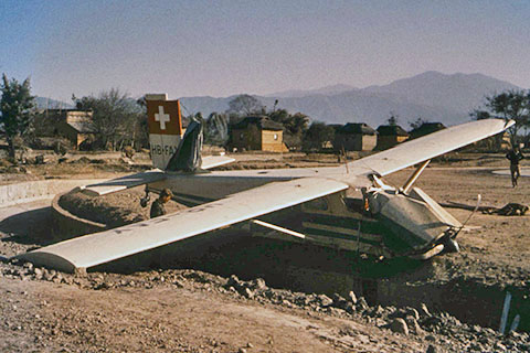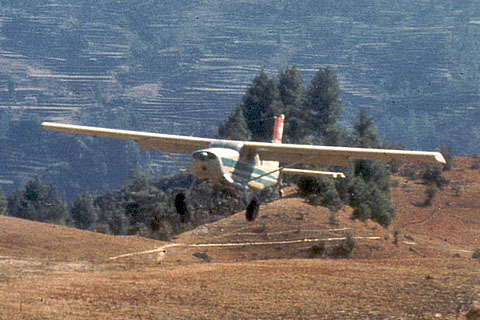 HB-FAX of CICR is approaching an airfield in Nepal - Photo by Karl Müller © 1961 | HB-FAX after the landing accident at Kathmandu - Photo by Fredy Rouge © 8-Feb-67 |