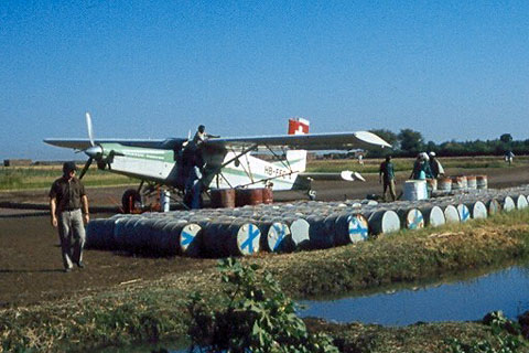 HB-FFC of Ciba-Pilatus at Bern-Belp with faded UN titles - Photo by Paul Schüpbach © 25-Jun-72 | HB-FFC of Ciba-Pilatus at Gezira Sudan taking a new load to spray - Photo by Heinz Mahrer © 1980 |