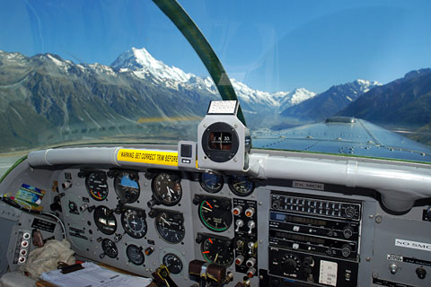 Cockpit view out of ZK-MCK heading Mount Cook - Photo by Richard Vandervord © 4-Feb-07 | ZK-MCK of Mount Cook Ski Planes on the Tasman Glacier - Photo by Richard Vandervord © 4-Feb-07 |