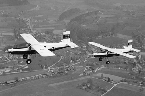 | 23253 & 23254 of USAF Berlin Brigade over a swiss village - Photo by Pilatus Flugzeugwerke © 1979 | HB-FCD of Pilatus testing a fertilization system at Buochs - Photo by Peter Wernli © Apr-67 |