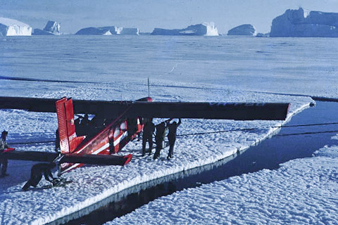 VH-FSB on board a ship heading towards the Mawson Base - Photo by Robbin Waterhouse © 1972 | VH-FSB rolled away with manpower from an ice-floe - Photo by Robbin Waterhouse © 1972 |