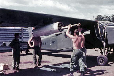 A14-681 of Australian Army in the original livery - Photo by Wim Zwakhals © 1969 | A14-681 of Australian Army at Nui Dat equipped with 19pod rocket tubes - Photo by Fred Reus © 1970 |