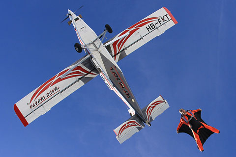 HB-FKT in new Flying Devil colors at Ecuvillens - Photo by Markus Herzig © 2-Apr-10 - MHP | HB-FKT of Flying Devil up in the sky with a wingsuit jumper - Photo by Lydie Rabasa-Lhoret © 3-Jun-11 |