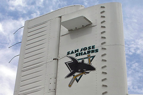 N908PL of GG Aircraft in San Jose Sharks colors at Pavas aiport - Photo by Daniel Umana © 1-Apr-04 | N908PL with the San Jose Sharks ice hockey team logo - Photo by Daniel Umana © 6-Apr-05 - JNET |