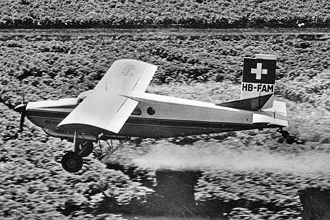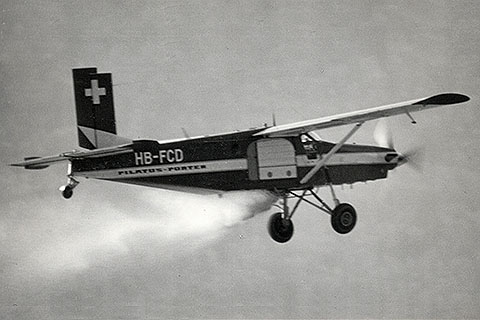 | 23253 & 23254 of USAF Berlin Brigade over a swiss village - Photo by Pilatus Flugzeugwerke © 1979 | HB-FCD of Pilatus testing a fertilization system at Buochs - Photo by Peter Wernli © Apr-67 |